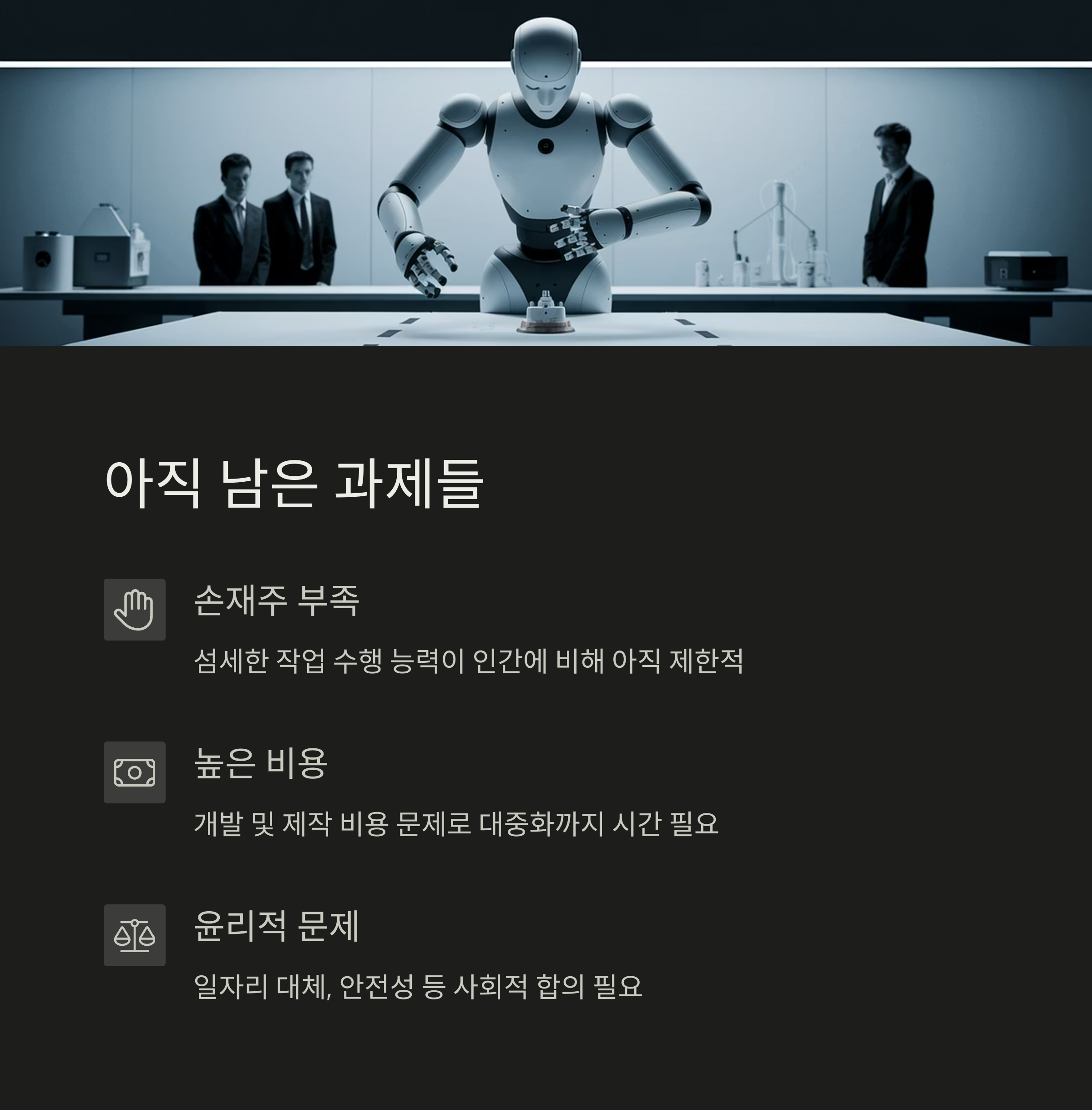 하지만 이러한 장밋빛 전망과 함께 해결해야 할 과제들도 존재합니다. 아직 로봇의 손재주(Dexterity)는 인간에 비해 부족하고, 복잡한 상황 판단 능력이나 예상치 못한 문제 해결 능력도 더 발전해야 합니다. 높은 개발 및 제작 비용 문제도 해결해야 하며, 로봇 도입으로 인한 일자리 문제나 윤리적, 사회적 합의 형성 등도 중요한 과제로 남아있습니다.