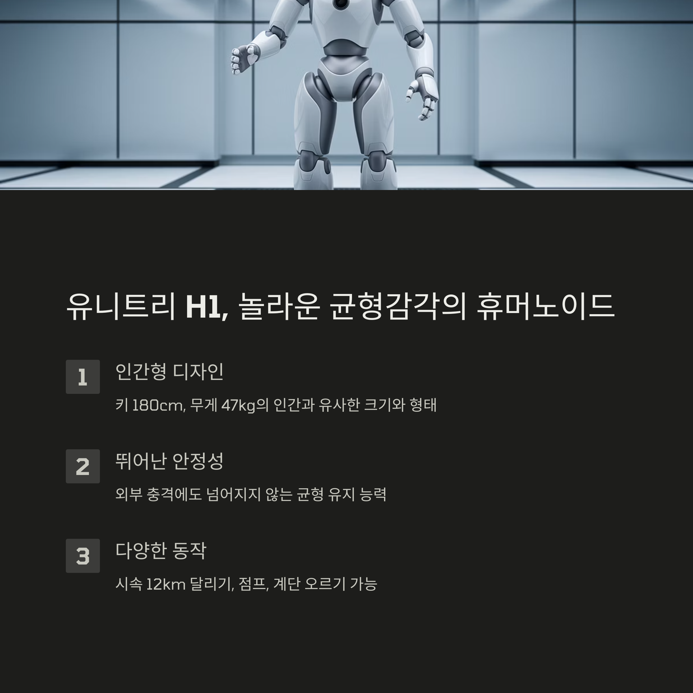 또한, H1은 시속 11.88km(초속 3.3m)의 속도로 달릴 수 있으며, 제자리 점프나 계단 오르내리기 등 다양한 동작을 수행할 수 있습니다. 물론 마라톤 선수들의 속도에는 아직 미치지 못하지만, 복잡한 두 발 보행으로 이 정도 속도와 안정성을 구현했다는 것 자체가 큰 기술적 진보입니다.