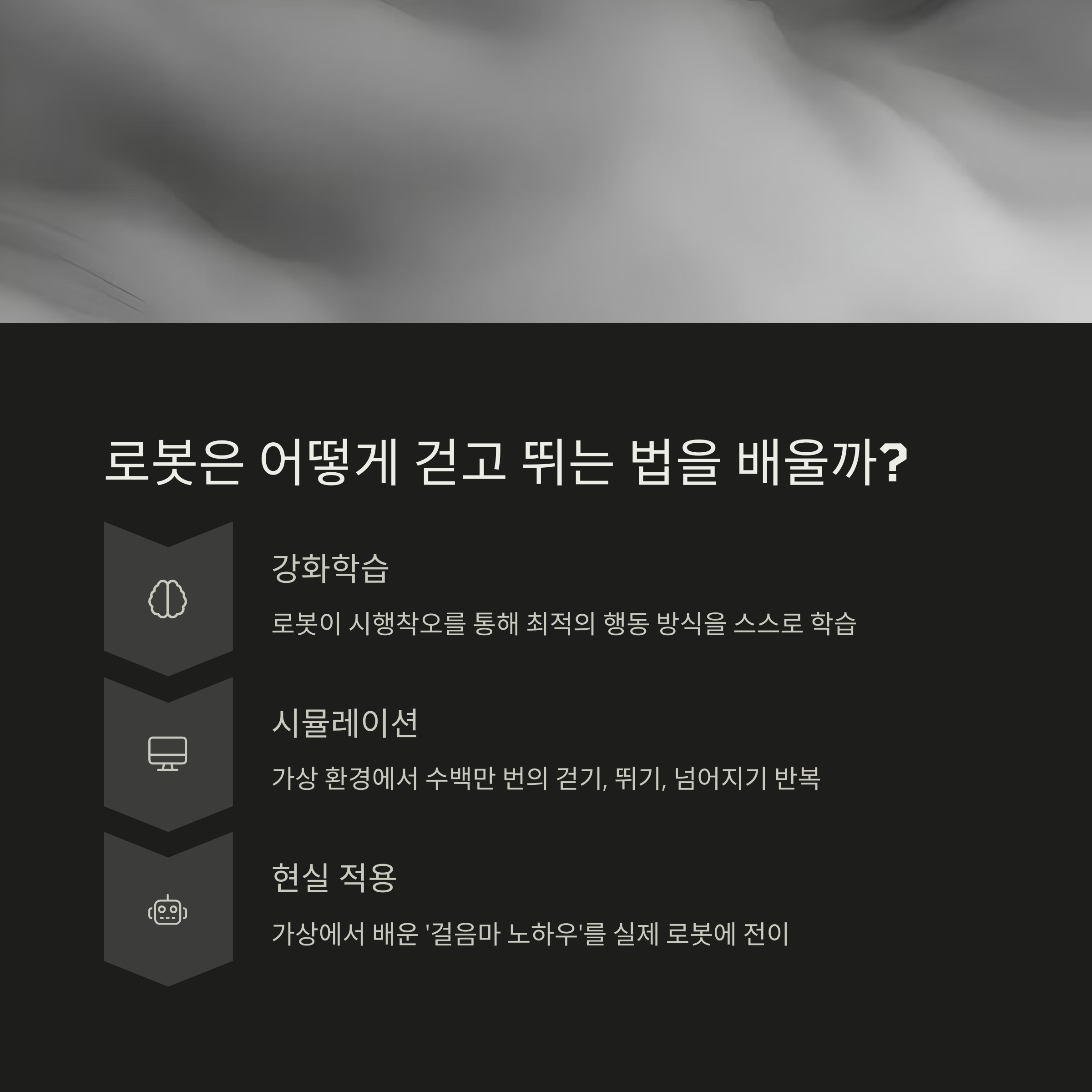 마치 우리가 아기 때 수없이 넘어지면서 걷는 법을 배우는 것처럼, 로봇도 비슷한 방식으로 학습합니다. 하지만 로봇은 실제 세상에서 넘어지면 고장 날 수 있으니, 가상 세계(시뮬레이션)에서 먼저 수백만, 수천만 번의 걷기, 뛰기, 넘어지기를 반복하며 가장 좋은 방법을 스스로 터득합니다(강화학습). 이렇게 가상 세계에서 배운 '걸음마 노하우'를 실제 로봇에게 옮겨 적용하는 것을 '시뮬레이션-현실 전이'라고 부릅니다. 덕분에 로봇은 훨씬 빠르고 안전하게 복잡한 움직임을 배울 수 있습니다.