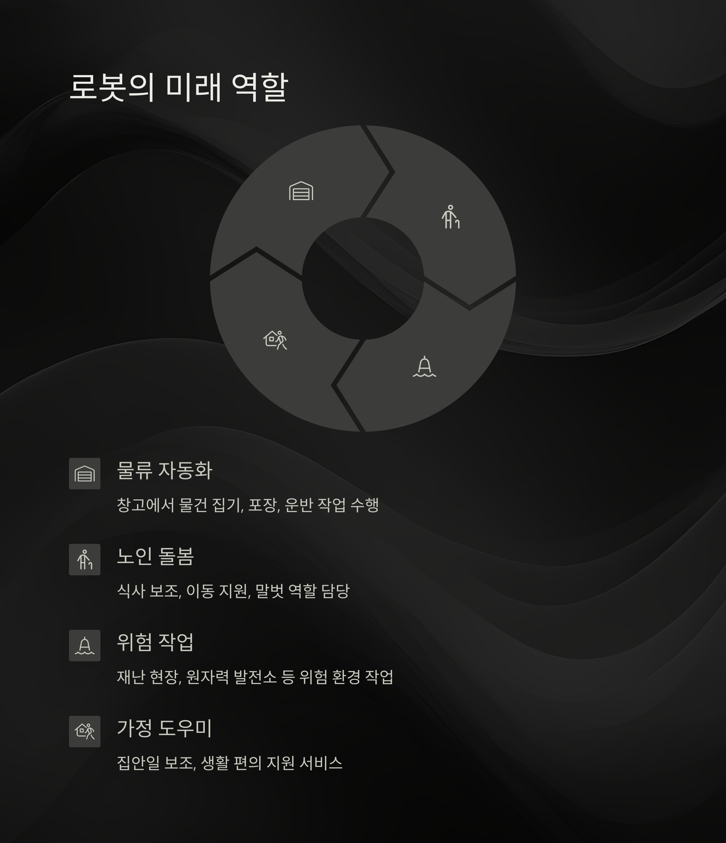 상상해보세요. 힘든 택배 상자 나르기, 할머니 할아버지의 식사 챙겨드리기, 위험한 공사 현장에서 일하기 등 사람이 하기 힘들거나 위험한 일들을 로봇이 대신해 줄 수 있습니다. 또한, 집안일을 돕거나, 외로운 사람들의 친구가 되어줄 수도 있겠죠. 물론 아직 해결해야 할 문제들이 많지만, 로봇은 우리 삶을 더 편리하고 안전하게 만드는 데 도움을 줄 잠재력이 매우 큽니다.