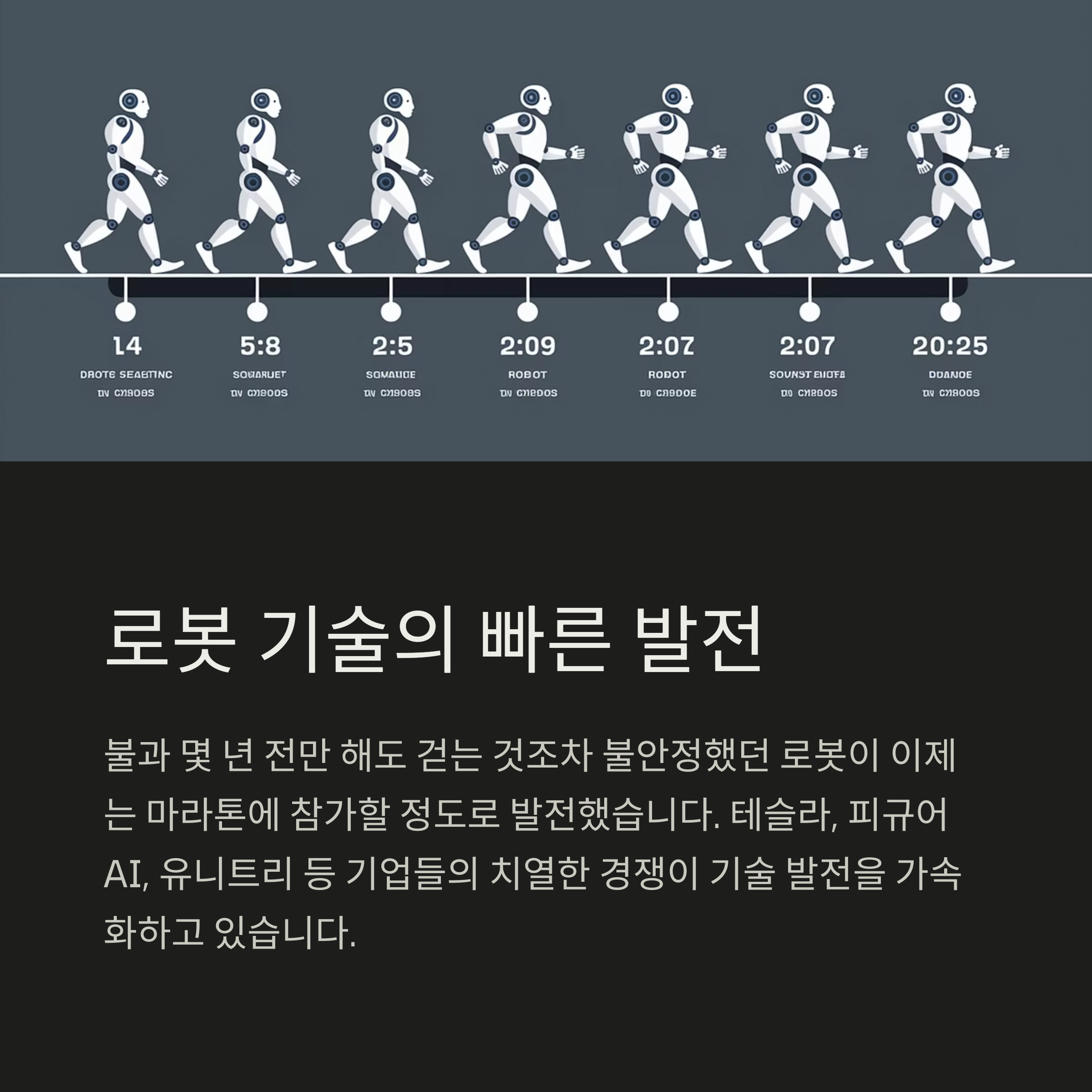 물론 이 로봇들이 실제 대회에 정식으로 참가하여 경쟁을 벌인 것은 아닙니다. 하지만 인간과 나란히, 비교적 안정적인 자세로 달리는 모습은 로봇 공학 기술, 특히 이족보행 로봇 기술이 얼마나 빠르게 발전하고 있는지를 보여주는 상징적인 장면이었습니다.
