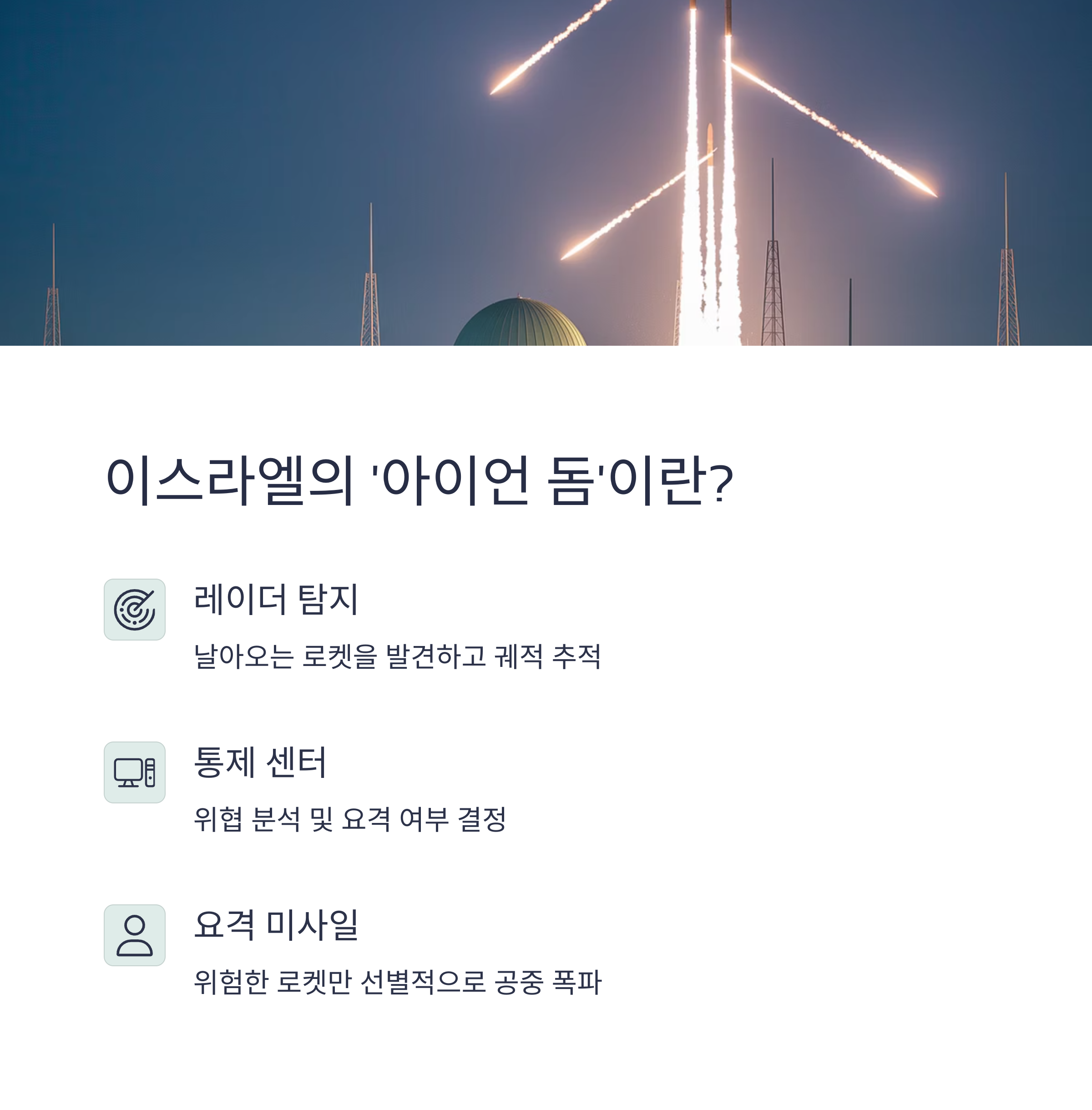 3. "발사!" (요격 미사일): 위험하다고 판단되면, 요격 미사일을 발사해서 날아오는 로켓을 공중에서 폭파시켜 버립니다. 사람이 살지 않는 빈 곳에 떨어질 것으로 예상되면 굳이 비싼 미사일을 쏘지 않습니다.