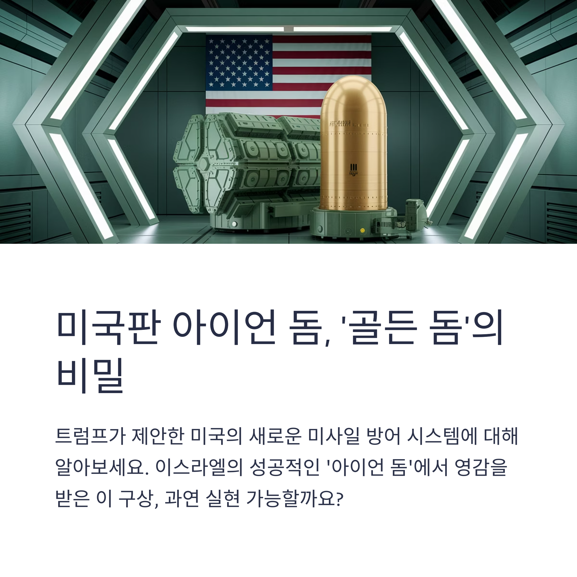 아이언 돔은 특정 종류의 위협에 매우 효과적인 시스템이지만, 미국이 직면한 복잡하고 다양한 미사일 위협, 특히 ICBM이나 극초음속 무기에 대한 해결책이 될 수는 없습니다. '골든 돔'은 기술적으로나 재정적으로 실현 가능성이 매우 낮아 보입니다.