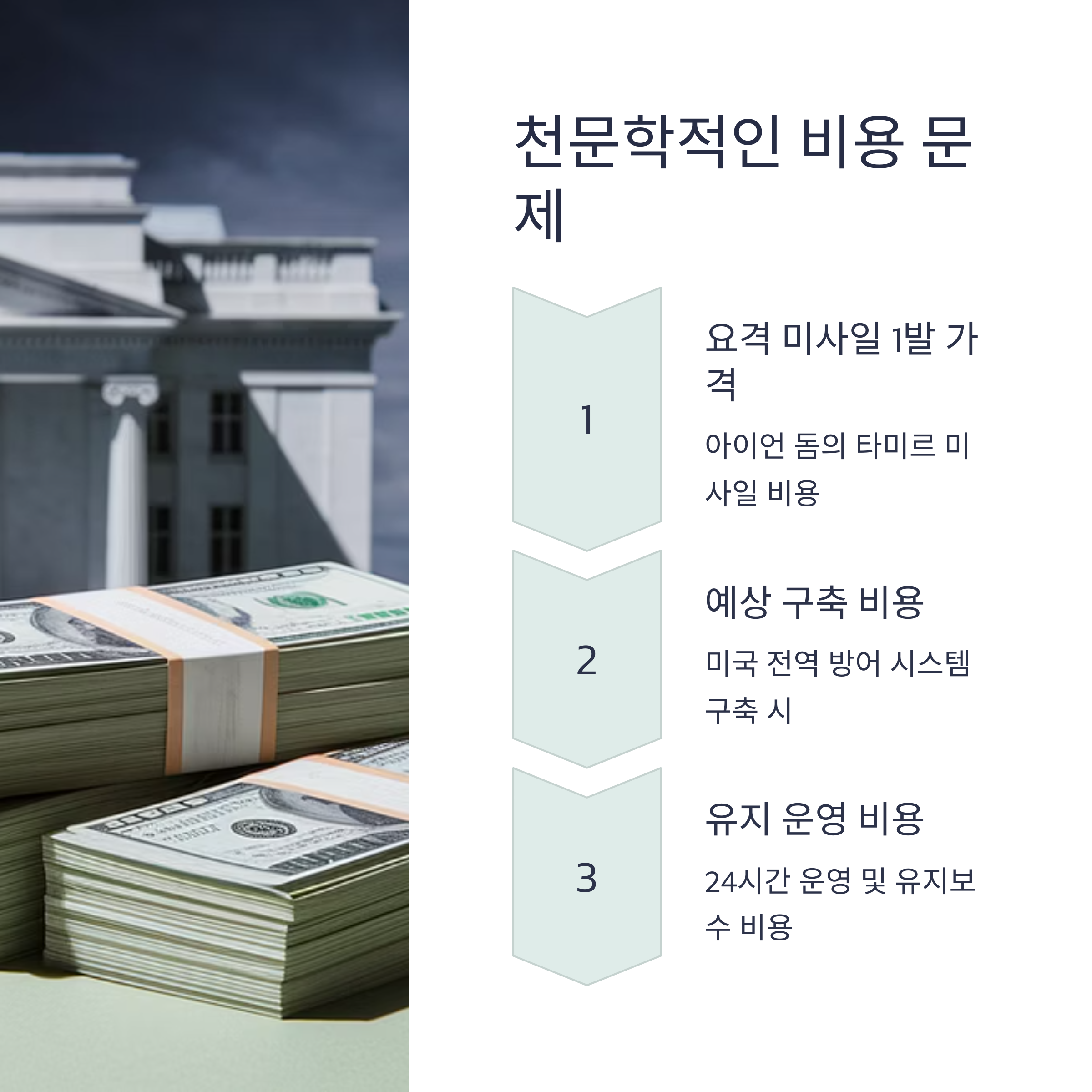 수많은 첨단 레이더와 고성능 요격 미사일 발사대를 미국 전역에 배치하고, 이를 24시간 운영 및 유지하는 데 드는 비용은 수천억 달러, 혹은 수조 달러에 이를 수도 있다는 추정이 나옵니다. 이는 미국의 막대한 국방 예산으로도 감당하기 어려운 규모일 수 있습니다.
