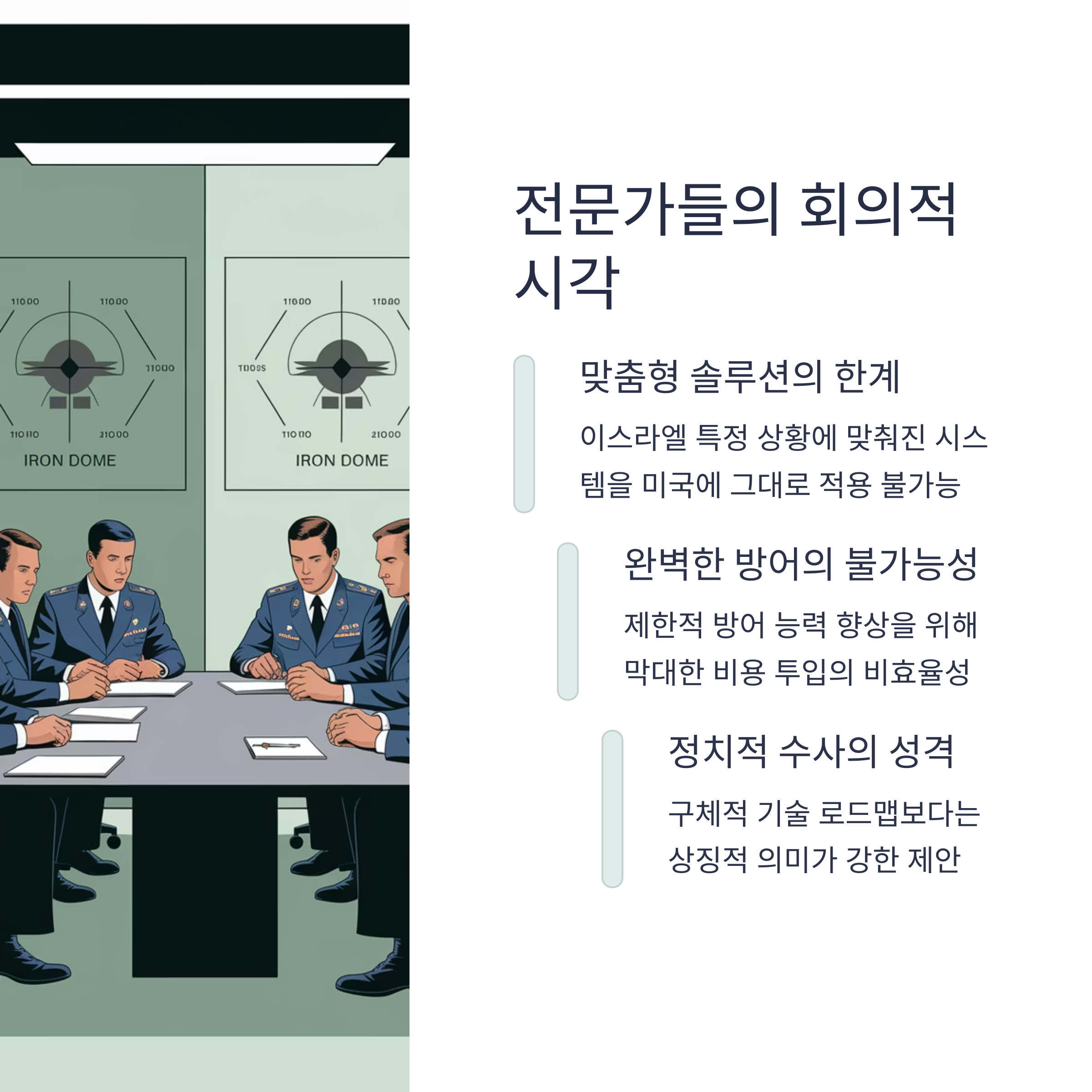 전문가들은 아이언 돔의 성공 사례를 미국 본토 방어에 직접적으로 적용하는 것은 근본적인 위협 환경의 차이를 간과한 것이라고 지적합니다. 즉, 아이언 돔은 이스라엘의 특정 안보 상황에 맞춰 개발된 '맞춤형 솔루션'이며, 이를 그대로 미국에 이식하는 것은 비현실적이라는 것입니다.