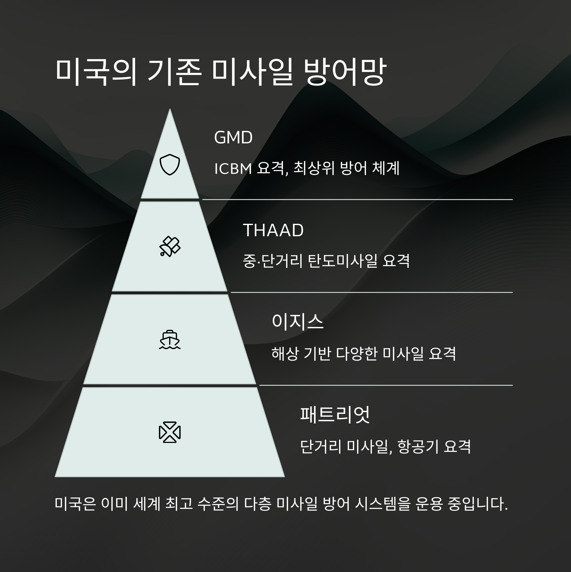 미국의 다층 방어망: 마치 겹겹이 쌓인 방패처럼, 서로 다른 고도와 단계에서 다양한 종류의 미사일 위협에 대응하도록 설계되어 있습니다. 특정 시스템이 실패하더라도 다른 시스템이 보완하는 구조입니다. '골든 돔'이 이 기존 시스템들을 어떻게 보완하거나 대체할 수 있을지에 대한 구체적인 설명은 아직 부족합니다.