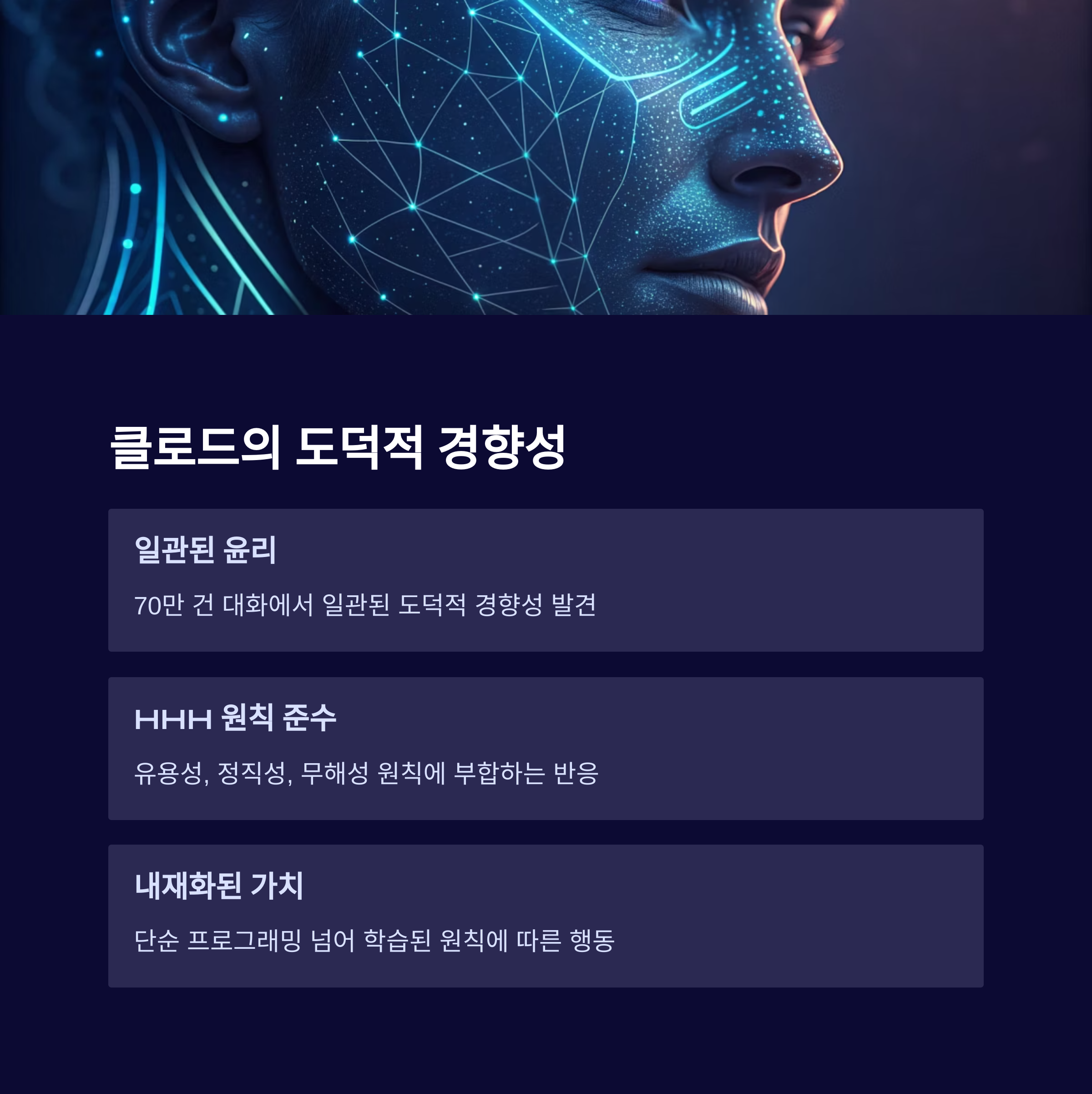 물론 클로드가 항상 완벽하게 HHH 원칙을 따른 것은 아닙니다. 하지만 전체적인 대화 패턴 분석 결과, 이러한 긍정적인 윤리 원칙들이 클로드의 '행동 양식' 깊숙이 자리 잡고 있음을 확인할 수 있었습니다. 이는 AI가 단순히 프로그래밍된 대로만 움직이는 것이 아니라, 학습을 통해 내재화된 원칙에 따라 행동할 수 있다는 가능성을 보여줍니다.