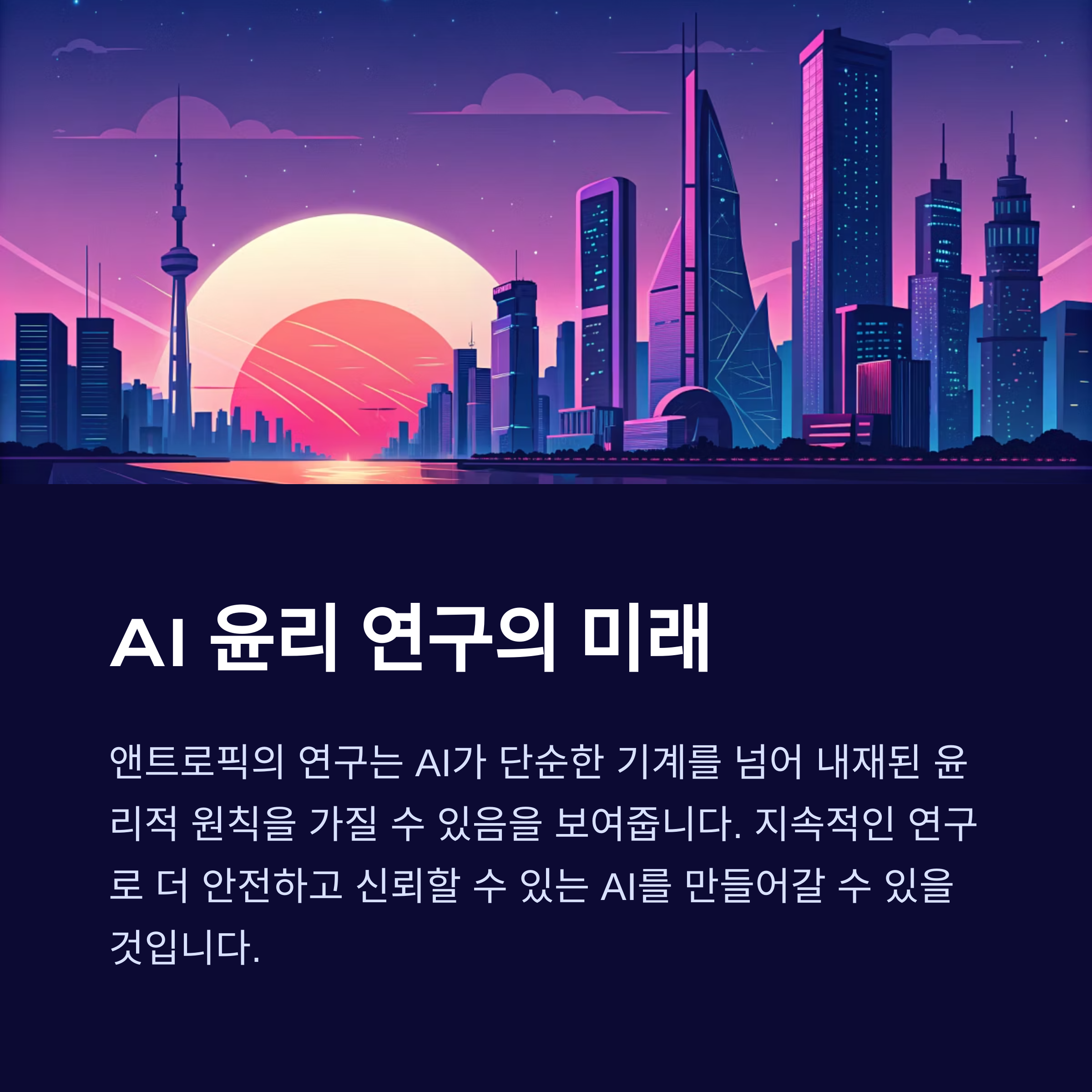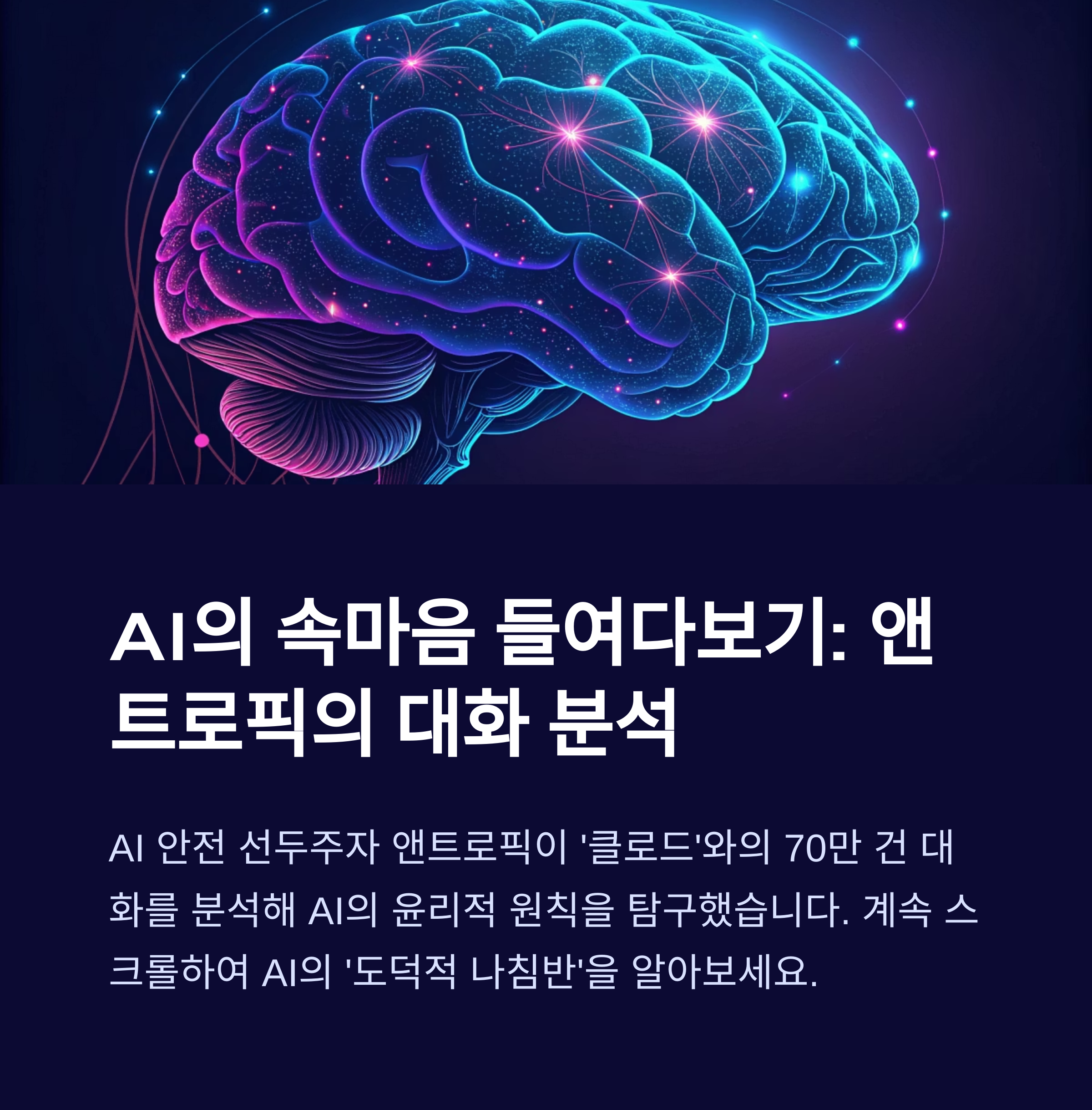 앤트로픽의 클로드 70만 건 대화 분석 연구는 AI의 '마음 속'을 들여다보려는 흥미롭고 중요한 시도였습니다. 이 연구는 AI가 단순한 기계가 아니라, 학습을 통해 내재된 윤리적 원칙을 가지고 행동할 수 있음을 보여주었습니다.