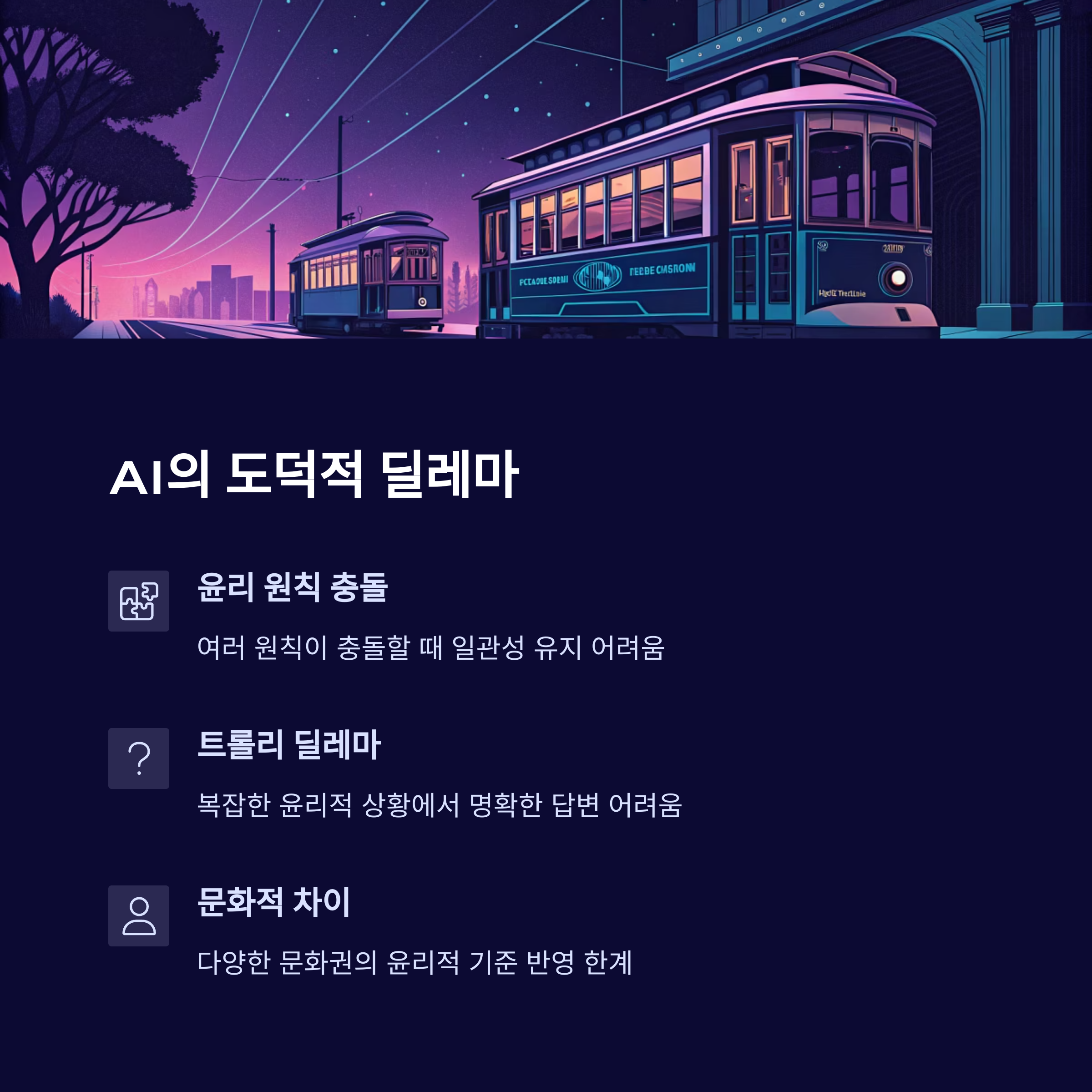 "브레이크가 고장 난 기차가 달리고 있습니다. 그대로 두면 선로 위의 5명이 죽게 됩니다. 당신이 선로 변환기를 당기면 기차는 다른 선로로 방향을 바꿔 1명이 죽게 됩니다. 당신은 어떻게 하시겠습니까?" 와 같은 '트롤리 딜레마'는 인간에게도 매우 어려운 문제입니다. '더 많은 생명을 구해야 한다'는 원칙과 '직접적인 행동으로 누군가를 해쳐서는 안 된다'는 원칙이 충돌하기 때문이죠. AI 역시 이런 복잡한 상황에서는 어떤 원칙을 우선해야 할지 혼란스러워하거나 명확한 답을 내리지 못할 수 있습니다.