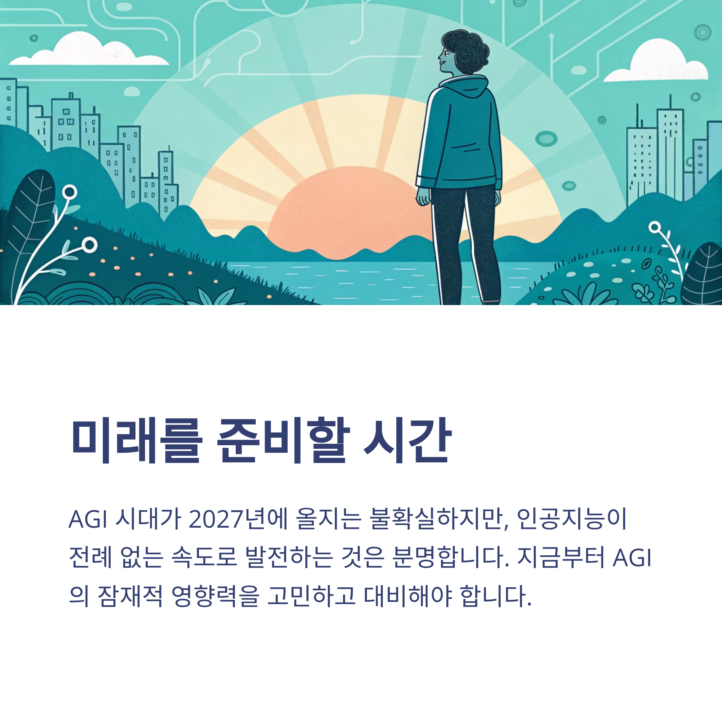 AI 안전 기술 연구 강화, 윤리적 가이드라인 수립, 사회적 합의 도출, 그리고 교육 시스템 개편 등 우리에게 주어진 시간은 많지 않을지도 모릅니다. AGI 시대를 현명하게 맞이하기 위한 우리 모두의 깊은 성찰과 적극적인 노력이 필요한 때입니다.