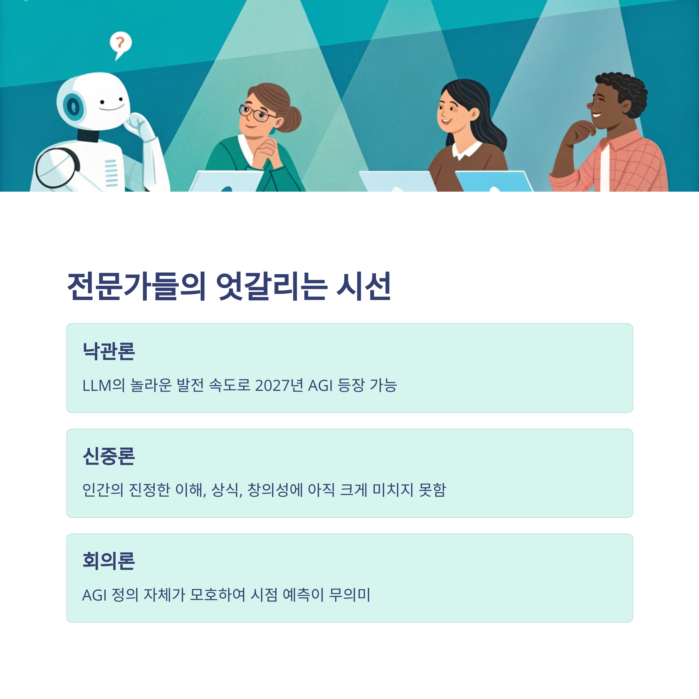 2027년 AGI 도래 예측에 대해 모든 전문가들이 동의하는 것은 아닙니다. AI 분야 전문가들 사이에서도 의견은 엇갈리고 있습니다.