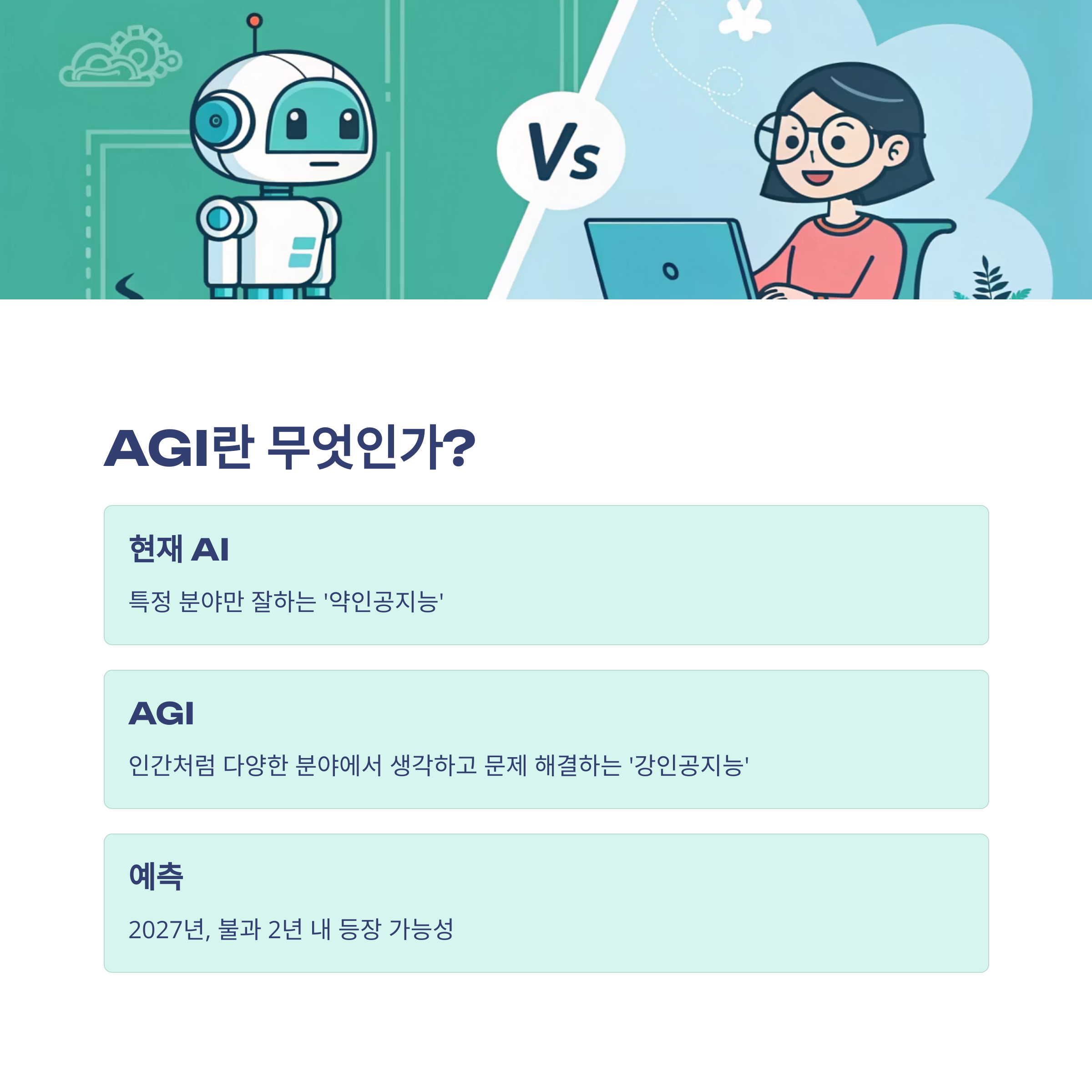 현재 우리가 사용하는 AI(챗봇, 이미지 생성 AI 등)는 특정 분야에서는 사람보다 뛰어나지만, 딱 그 분야만 잘합니다. 이것을 '약인공지능'이라고 해요. 반면 AGI는 인간처럼 다양한 분야의 지식을 배우고, 스스로 생각하고, 새로운 문제를 창의적으로 해결할 수 있는 범용적인 지능을 가진 AI를 말합니다. 마치 만능 로봇처럼 어떤 일이든 사람 수준으로 해낼 수 있는 거죠. 아직 현실에는 존재하지 않지만, AI 기술의 궁극적인 목표 중 하나입니다.