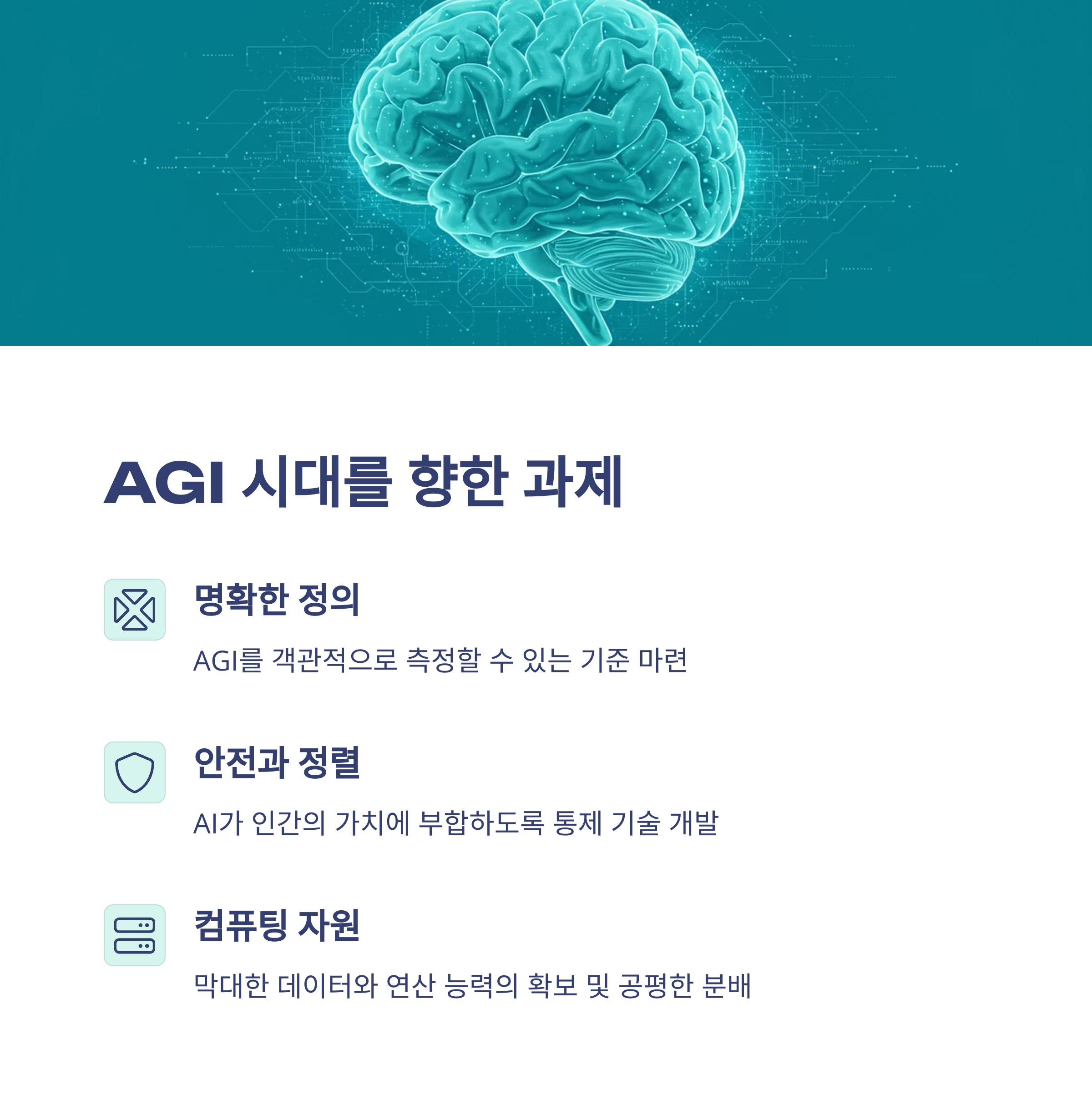 이 외에도 AGI 개발에 따른 윤리적 문제, 법적 책임 문제, 사회적 합의 형성 등 해결해야 할 과제들이 산적해 있습니다.