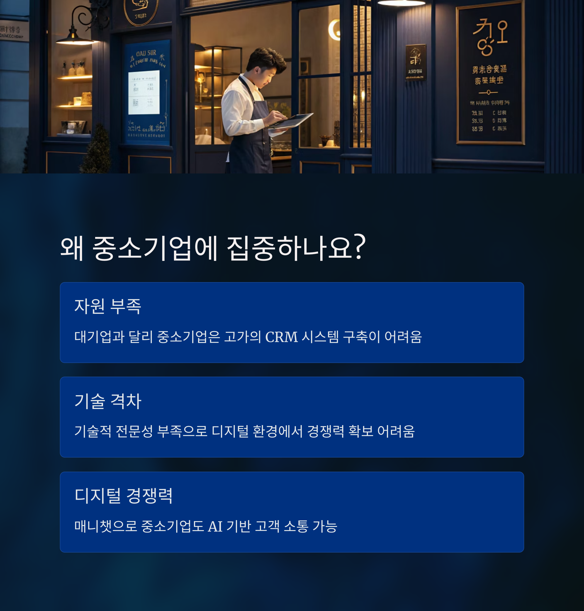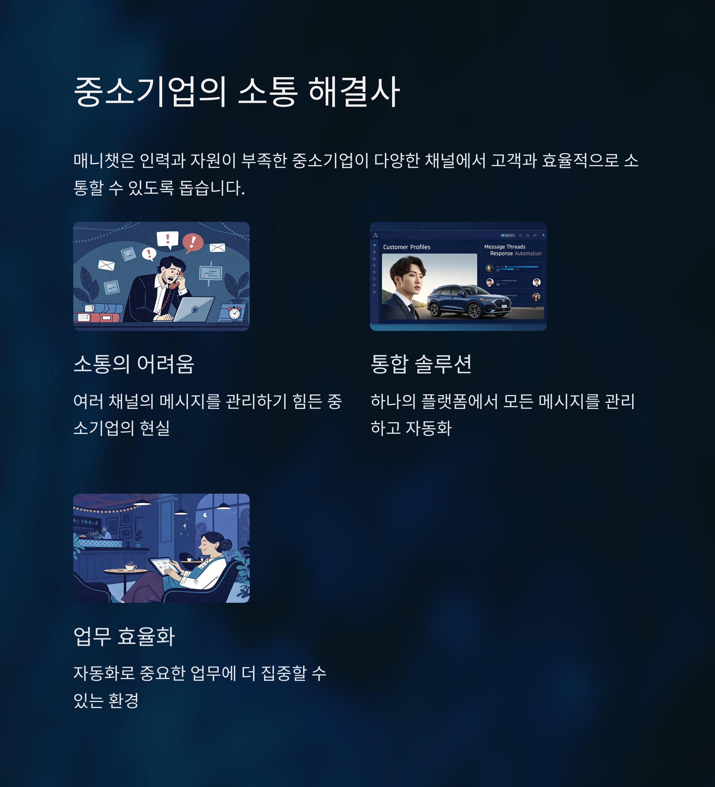 매니챗이 특히 중소기업(SMB, Small and Medium-sized Businesses) 시장에 집중하는 이유는 무엇일까요? 대기업들은 자체적으로 고객 관계 관리(CRM) 시스템을 구축하거나 고가의 전문 솔루션을 도입할 여력이 있지만, 대부분의 중소기업은 자금과 인력, 기술적인 전문성이 부족하여 효과적인 고객 관리에 어려움을 겪습니다.