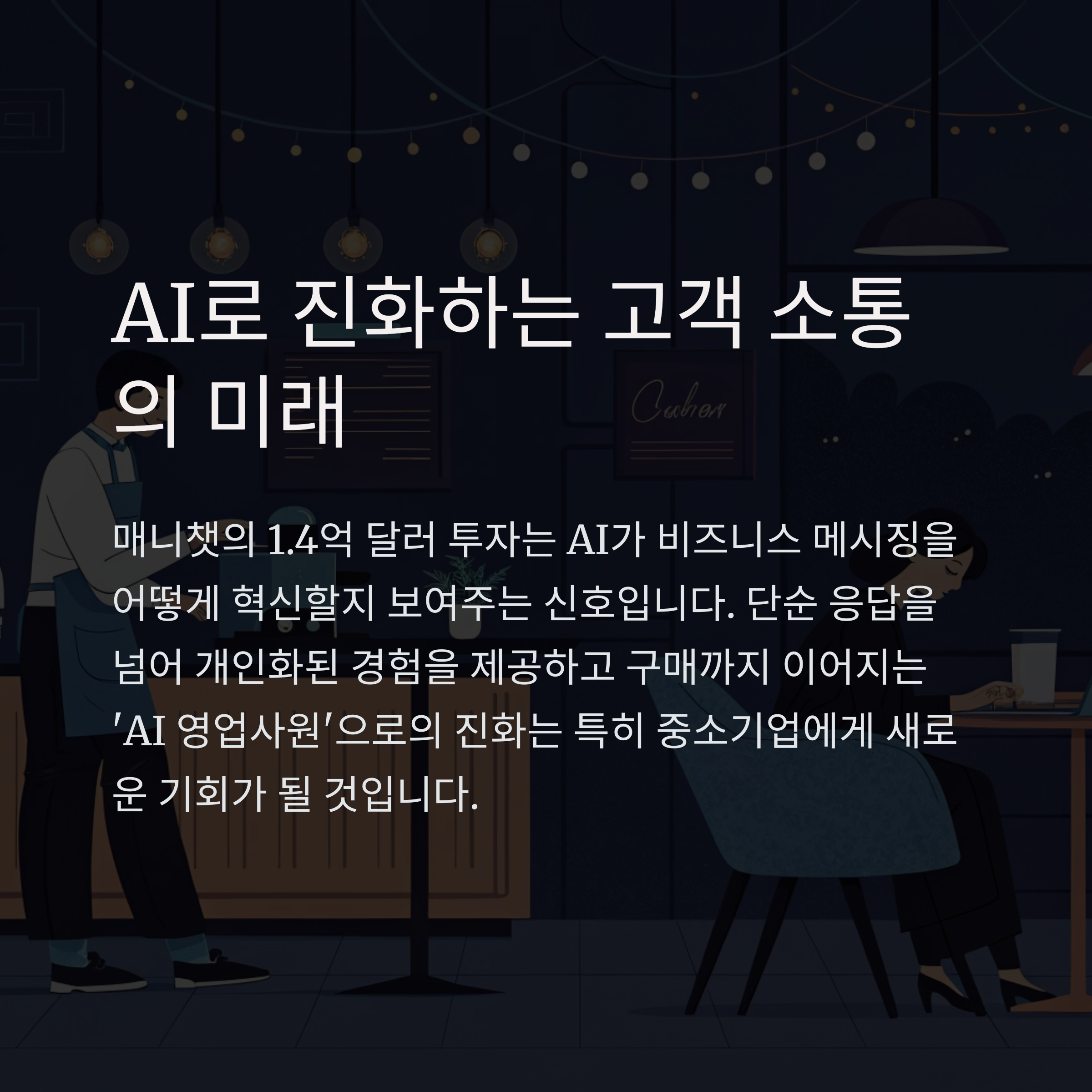 매니챗의 1억 4천만 달러 투자 유치와 AI 기능 강화 계획은 단순히 한 기업의 성장을 넘어, 비즈니스 커뮤니케이션의 미래가 어떻게 변화할지를 보여주는 중요한 이정표입니다. AI 기술은 기업이 고객과 소통하는 방식을 근본적으로 바꾸어 놓을 잠재력을 가지고 있습니다.
