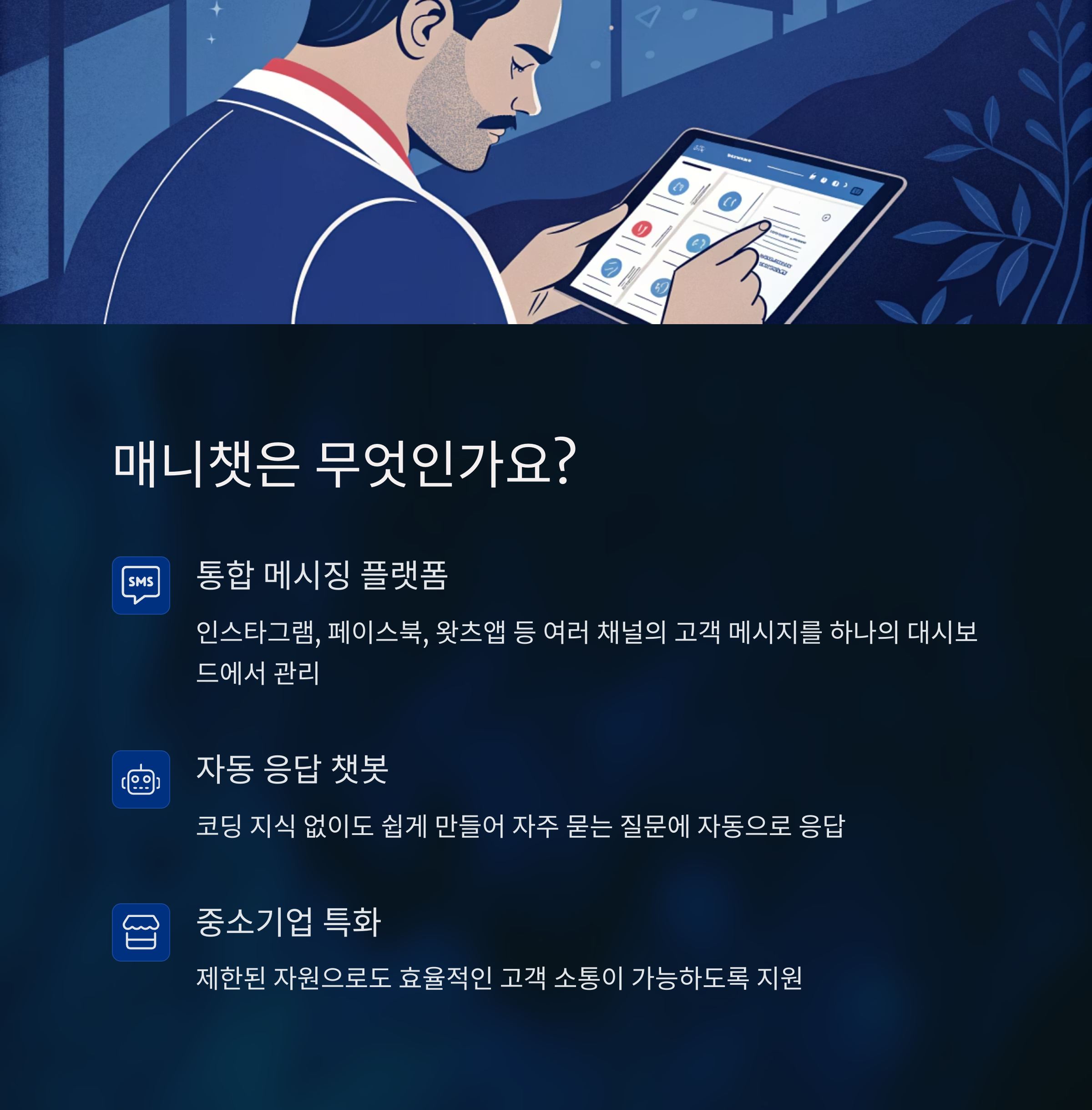 작은 가게나 회사를 운영한다고 상상해보세요. 손님들이 인스타그램 쪽지, 페이스북 메시지, 카카오톡 채널 등 여기저기로 문의를 보내옵니다. 이걸 하나하나 다 확인하고 답장하기 너무 힘들겠죠? 매니챗은 이런 다양한 채널의 메시지를 한 곳에서 관리하고, 자주 묻는 질문에는 미리 설정해둔 답변이 자동으로 나가도록(챗봇) 도와주는 서비스입니다. 덕분에 사장님은 중요한 업무에 더 집중할 수 있고, 고객들은 빠르고 편리하게 원하는 정보를 얻을 수 있습니다.